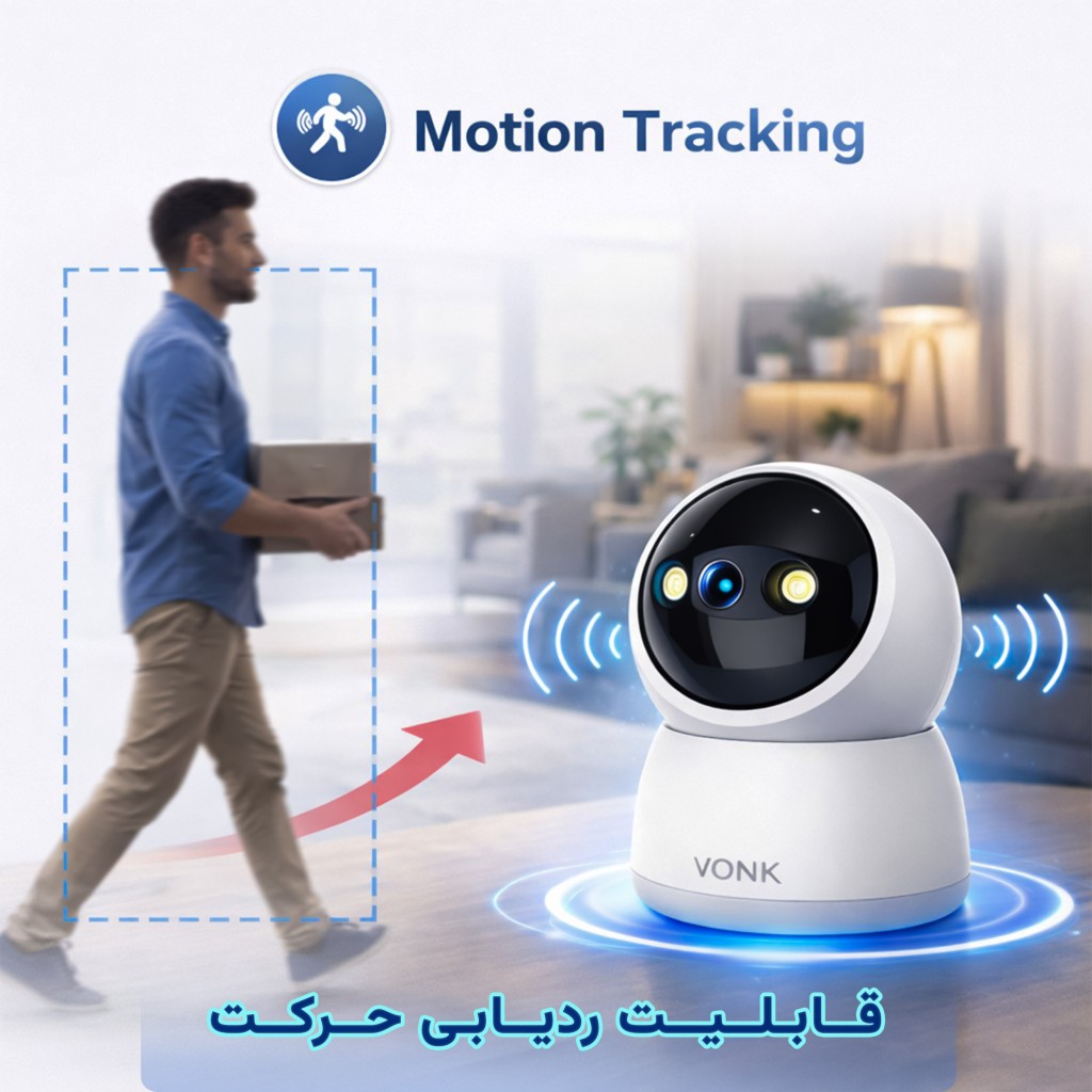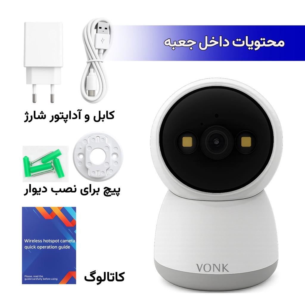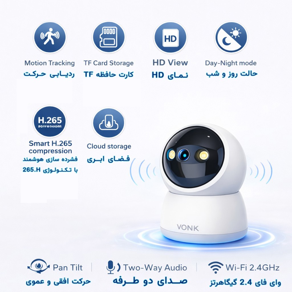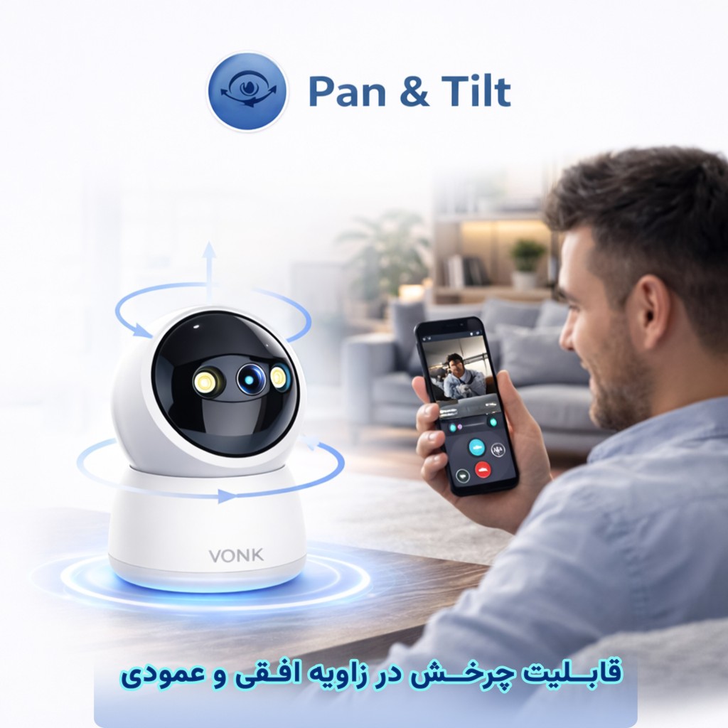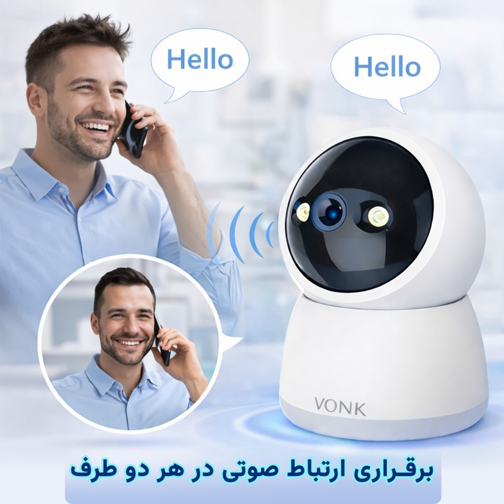 دوربین مداربسته بی سیم جمع و جور VONK M2 3MP با کیفیت۳ مگاپیکسل، دید در شب سیاه و سفید (مادون قرمز) و دید در شب به صورت رنگی و... چرخش ۳۶۰ درجه ای و حرکت عمودی 120 درجه ای و پشتیبانی از وای فای 2.4 گیگا هرتز ؛ مناسب نظارت خانه و محل کار...